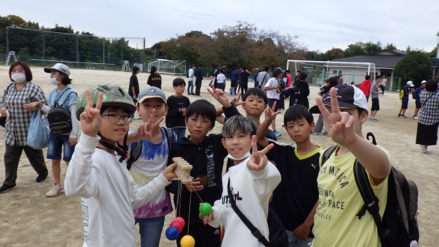 けん玉やストラックアウトなど遊びを楽しむ子と