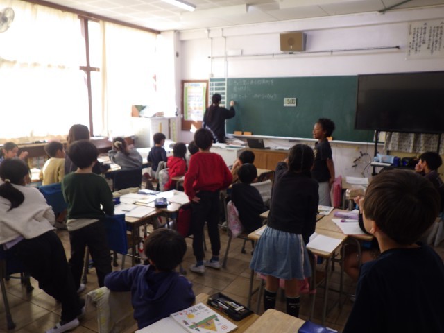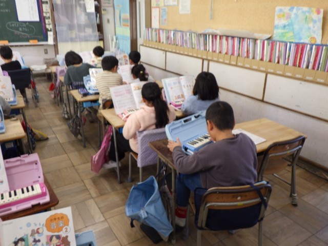 音楽では、鍵盤ハーモニカで「こいぬのマーチ」の練習をしました。