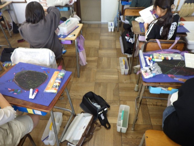図工では、さまざまな模様の甲羅をしたカメを描いています。各自が工夫して絵を描いています。