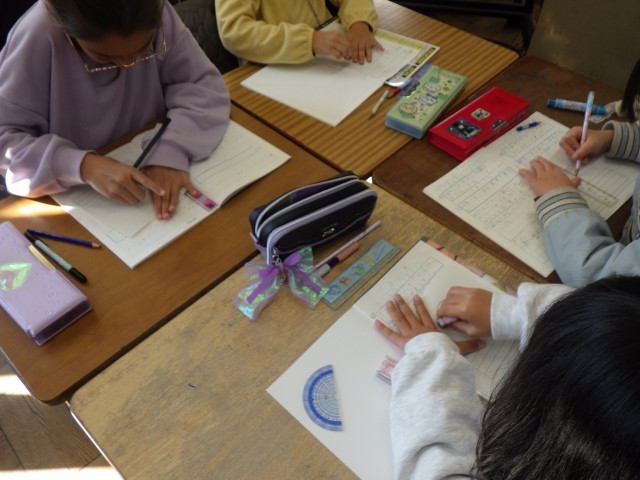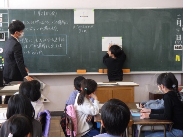 3年1組では玉入れを題材にして、4人の先生がどの位置から玉を投げると平等の距離で投げることができるか考えました。