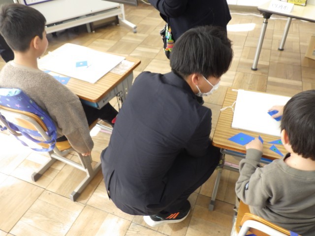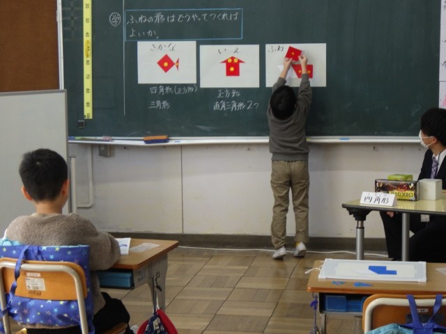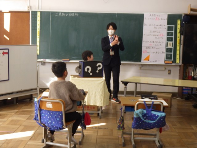 なかよし学級では3年生の児童2人と授業を行いました。三角形と四角形について、模型を手で触りながら特徴を確認しました。