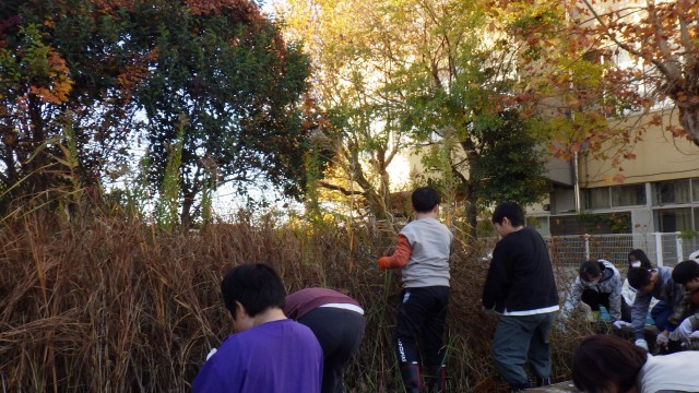 中部小学校のビオトープの周りをきれいにしています。