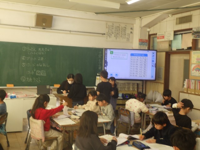 算数では九九の練習に一生懸命です。プリントの問題を解いたり、暗唱をしたりすることができました。