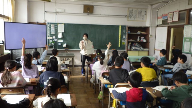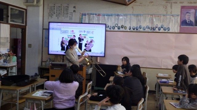 音楽では、管楽器の学習をしました。トロンボーン、チューバ、ホルン、トランペットなど、実物を見ながら学ぶことができました。