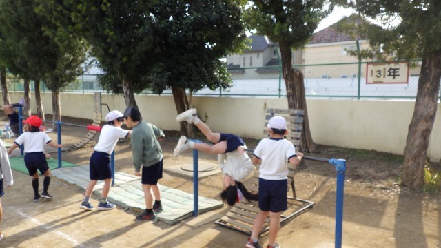 体育では、鉄棒に元気に取り組みました。逆上がりや足かけ回り、地球回りなど、いろいろな技に積極的にチャレンジしました。