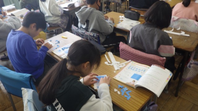 教科書に載っている算数のチャレンジ問題「ペントミノ」に取り組むクラスもありました。大人が解いても難しいパズルの問題について、試行錯誤しながら、一生懸命考えて解きました。