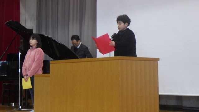 その後、3年生と4年生の代表児童から2学期にがんばったことの発表がありました。テストに向けた勉強や持久走など、がんばったことについて、全校児童の前で立派に発表できました。