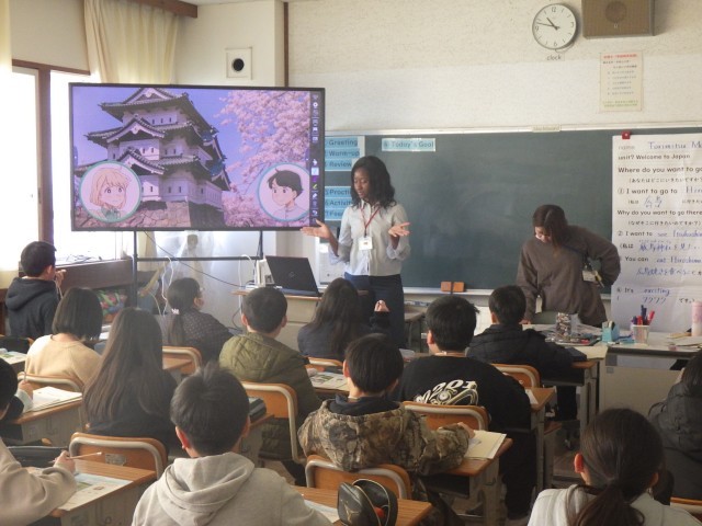 外国語では、日本の名所の紹介について取り組んでいます。紹介するための英語での表現について、ALTと担任とで学びました。