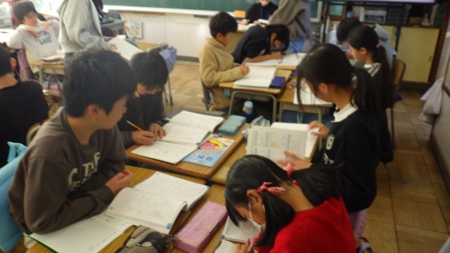 算数では、6年間のまとめの問題に取り組んでいます。グループの形で沢山の練習問題を解きました。