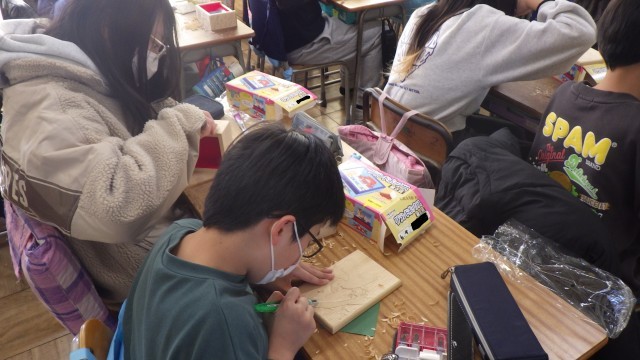 3月の卒業に向けて卒業制作に取り組んでいます。彫刻刀を使い、オルゴールを入れる木の箱の模様を彫りました。