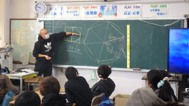 算数では円周の長さと直径の長さの関係について、学びました。円の中に多角形を描いて考えました。