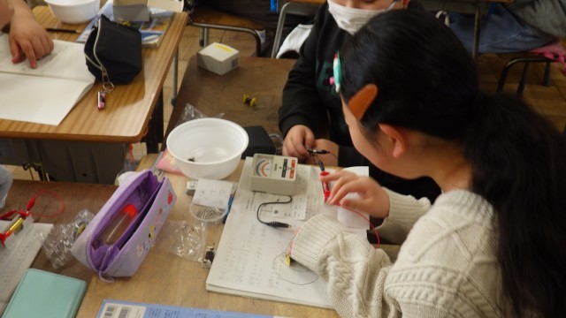 理科は、教室で電磁石の実験をしました。電磁石の強さとコイルの巻き数の関係について、グループで実験しながら調べました。