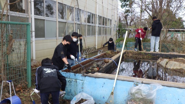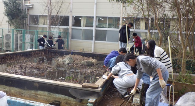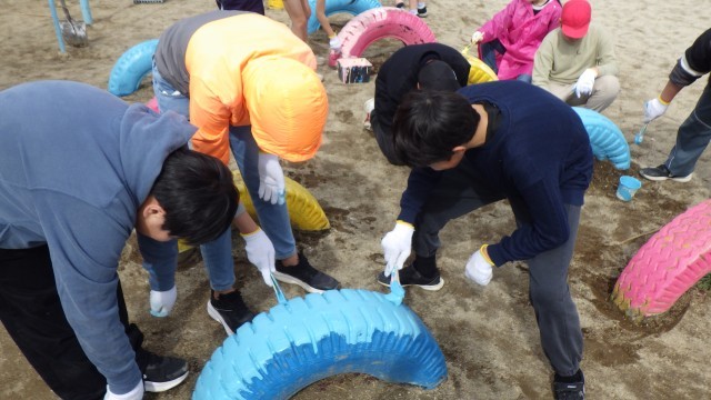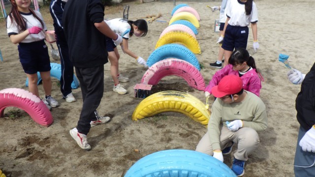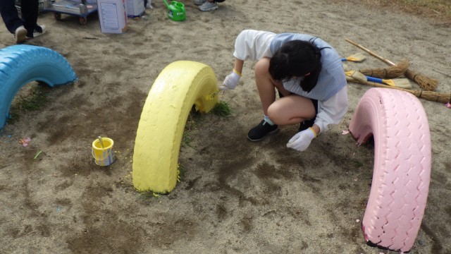 在校生、学校のためにできることを考え、本日は6年4組がビオトープ周りの清掃とタイヤのペンキ塗りをしました。