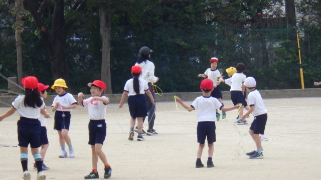 なわとびに挑戦する姿、遊具で楽しむ姿。
