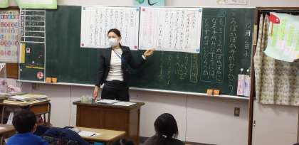 子どもたちは大勢の先生方が参観する中、緊張しながらもよく集中して授業に参加しています。先生達は、この研修を通して、互いに指導法を学び、これからの指導に活かしていきます。