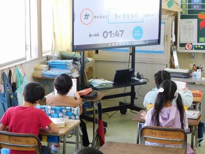 2組は、国語の学習を行っていました。国語辞典を使って、「○ではじまる△△△なもの」を考えて早く調べる取り組みを行っていました。辞書の調べたページに付箋を貼っている児童がいました。