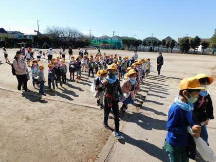 1・3組が「秋さがし」というねらいで貝殻山公園に行きました。初めての校外での学習ということで、学年の先生方はルールを明確にし、感染対策をしっかりとして出発しました。子どもたちは、楽しくてうきうき気分の中でも、担任の先生の話をしっかりと聞き、充実した時間を過ごしていました。