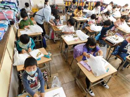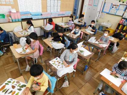 学校に戻ってきて、拾ってきたどんぐりの実や落ち葉を貼り絵にしていました。とても楽しそうな表情で制作していました。