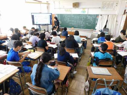 1組は、算数の学習をしていました。単元は「比例と反比例」でした。この内容は、中学の関数につながっていく内容です。「わからない」は、すぐに質問して攻略していきましょう。