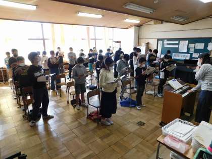 3組は、音楽室で音楽の学習をしていました。讃美歌をきれいな声で歌っていました。音楽室は、窓・扉を開けて十分な換気をし、1mのディスタンスをとって、向かい合わずに、きれいな声で、歌の学習をしています。