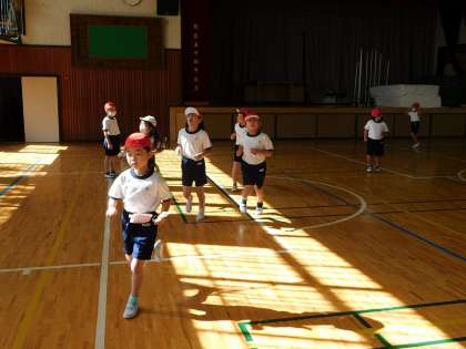 体育館に行くと、2組が体育の学習をしていました。しっかりと準備運動を行っていました。今、体育の学習では、体力づくりとして、○分走を行っています。1年生は3分間走でした。ペース配分がまだわからず、走り続けることがなかなか難しいようです。