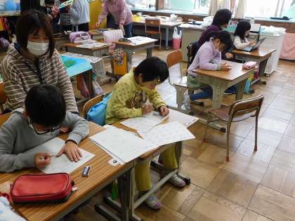 なかよし1組に行きました。2組と合同でグループごとにそれぞれの学習をしていました。図工の色塗りをしている人、算数のプリントをやっている人、クロムブックを使っている人、皆集中して一生懸命に取り組んでいました。
