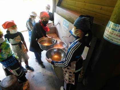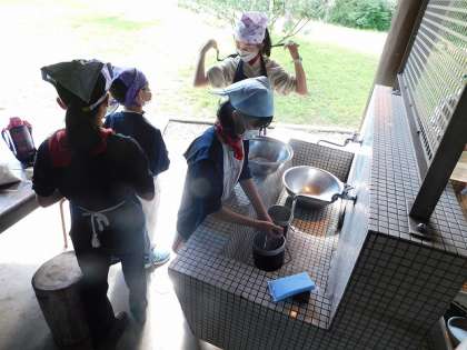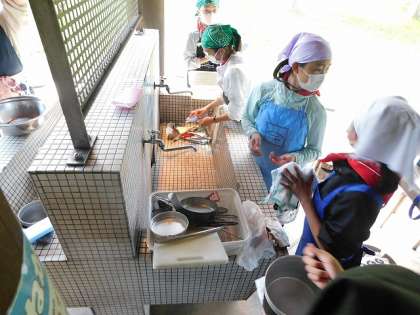 野外炊飯2 まずは、鍋や飯盒などの道具を洗います。