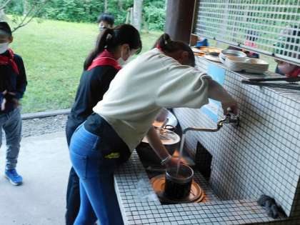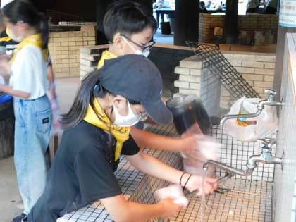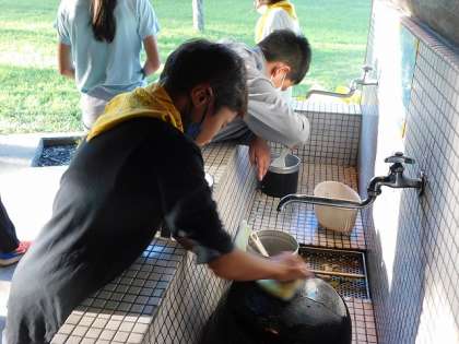 野外炊飯7 食べた後は、みんなで後片付け。飯盒となべを洗うのが大変だったようです。