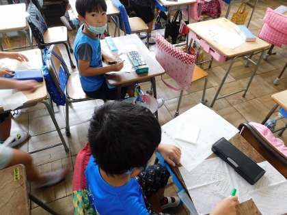 図工の学習で「たたきぞめ」を行っていました。ティッシュペーパーを四つ折りにして、水性マジックで模様を描き、開くときれいな模様になる作業です。とても楽しそうでした。