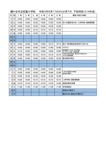 5月17日から6月7日までの下校時刻一覧掲載について