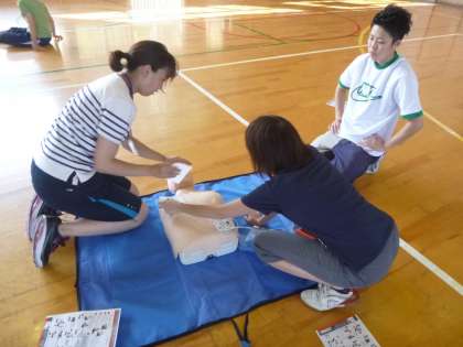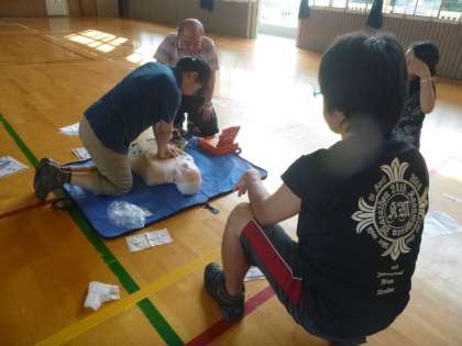 プール開きが行われる来週に先立ち、心肺蘇生法の講習です。