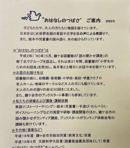 おはなしのつばさ(紹介) 公開日 2022/05/09 更新日 2022/05/09 お知らせ 毎週月曜日、読み聞かせを行ってくださっている「おはなしのつばさ」についてです。 生の声による読み聞かせを通して、物語など本の楽しさや面白さを伝えてくださっています。 活動内容もご覧になれるそうです。 http://ohanashinotubasa.web.fc2.com/