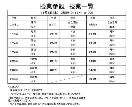 土曜参観 授業一覧掲載 公開日 2022/11/05 更新日 2022/11/05 お知らせ 11月5日(土)に行われる土曜参観の授業一覧です。9:15〜10:00の時間帯(2校時目)で展開します。なお、予定ですので今後変更される場合もあります。ご了承ください。