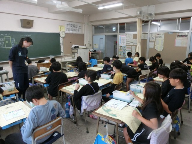 図工の学習では、ゴーヤを持つ自分を描いていました。今日は下描きも終わり、絵の具に入っていました。ゴーヤの下地をまずは薄い緑で集中して塗っていました。