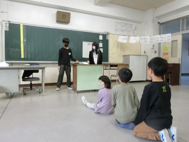 12月2日 道っ子交流会 木曜日の本番に向けて6年生が1年生に説明をしているよ。