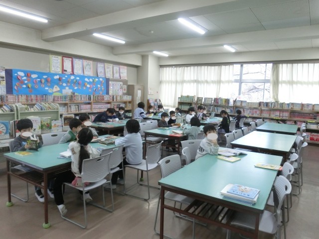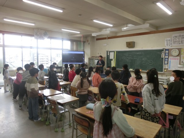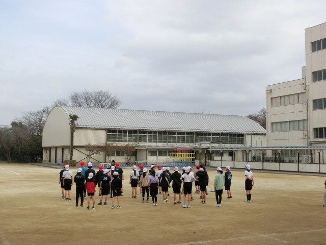 2月24日 5年生校庭体育、1年生読書・教室で呼びかけ練習
