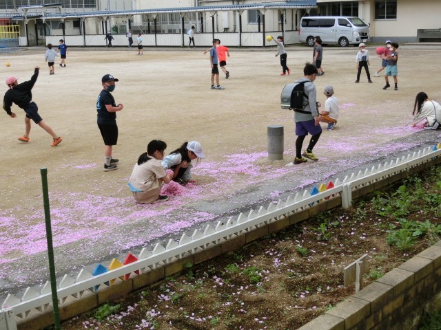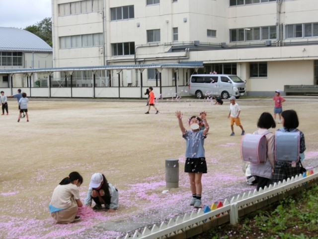 4月21日 朝の時間 校庭に花びらの絨毯が!きれい!