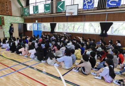 2年生初めての学年集会 1年生が入学しておにいさんおねんさんとなり、2年生でもがんばろうという意識を感じます。