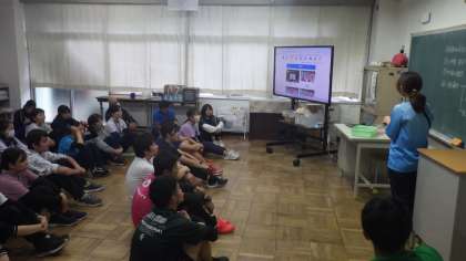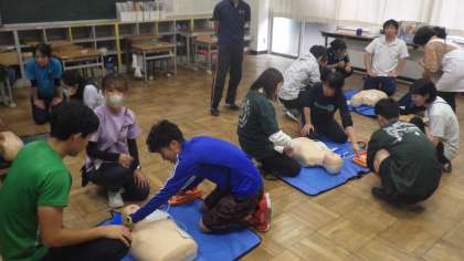 放課後、鎌ケ谷市の心肺蘇生法普及員の資格を持った職員を講師に、心肺蘇生法の研修を行いました。1分間に100〜120回のペースで胸骨圧迫を行い、AEDの使用方法を確認しました。