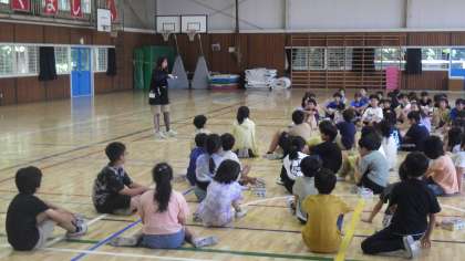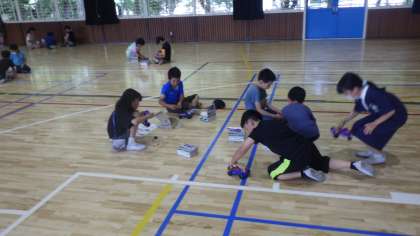 理科では、直列つなぎと並列つなぎの違いを、体育館で実際に車を走らせて確かめました。