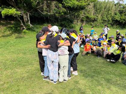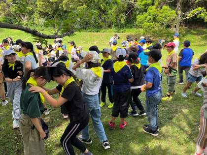 その後は浜近く丘でイニシアティブゲーム。学年の仲間や先生方とコミュニケーションをとりながら、ミッションをクリアしたり、自然を使って遊んだりしました。