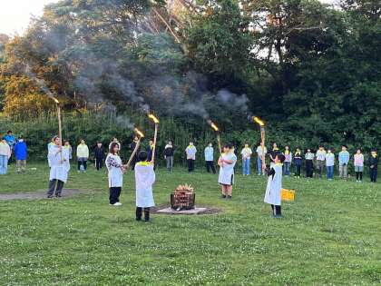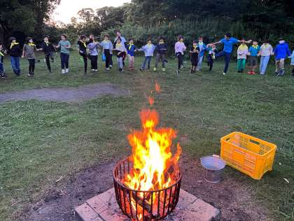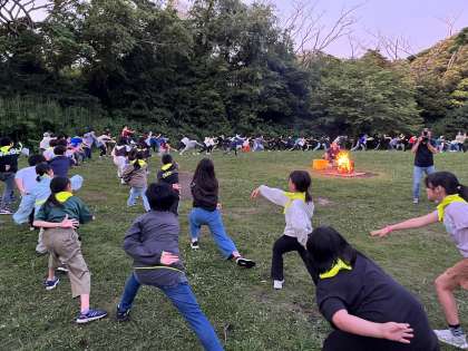 林間学校7 公開日 2024/06/19 更新日 2024/06/19 お知らせ 夜は一大イベント、キャンプファイヤーです。 火の神から火の子が火を受け、各クラスがそれぞれ「挑戦」「友情」「思いやり」「協力」について誓いました。 点火した後はキャンプファイヤー係を中心に、レクやダンスで大きく盛り上がりました。 体調不良者もなく、無事に1日目の行程を終えようとしています。 本日の投稿はこれで終わりとなります。明日は鴨川シーワールドに行ってきます。