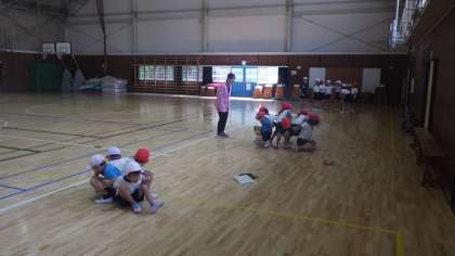 また、体育館では、友達と協力して手を使わずに立つ動きを行っており、楽しみながら体を動かしていました。