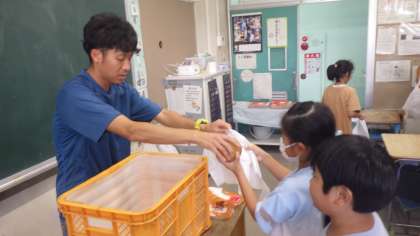 総合的な学習の時間にお世話になっている大野梨園さんから、3年生の児童へ梨のプレゼントがあり、担任から一人ひとりに手渡されました。