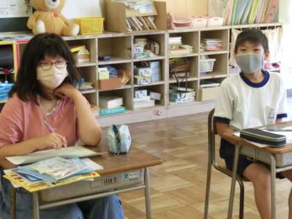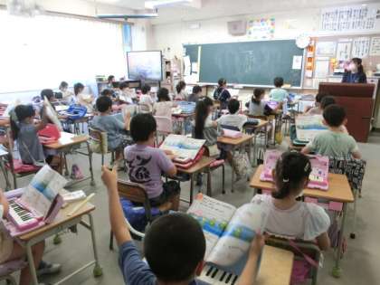 2年生、先生の伴奏に合わせて、鍵盤ハーモニカをテキパキ準備していました!