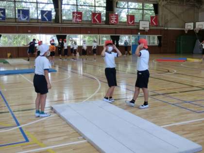 5年生、体育でマット運動の学習中でした。