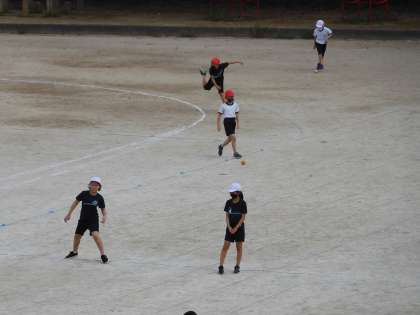 4年生、ソフトボール投げの練習をしていました。 より遠くへ!