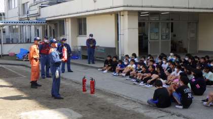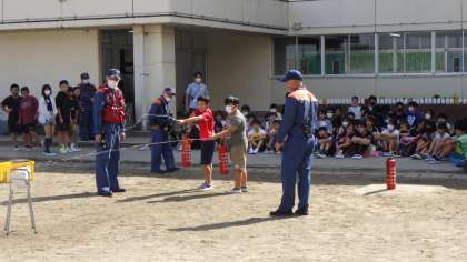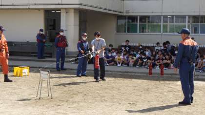 10月7日 6年生 公開日 2024/10/07 更新日 2024/10/07 お知らせ 避難訓練の後に6年生だけ残り、消防署の方に教えてもらいながら、消火器体験を行いました。大きな声で「火事だー!」と叫び、「火元をほうきで掃くように」を合言葉に、消火器で火を模した的あてをしました(練習用なので中身は水)。