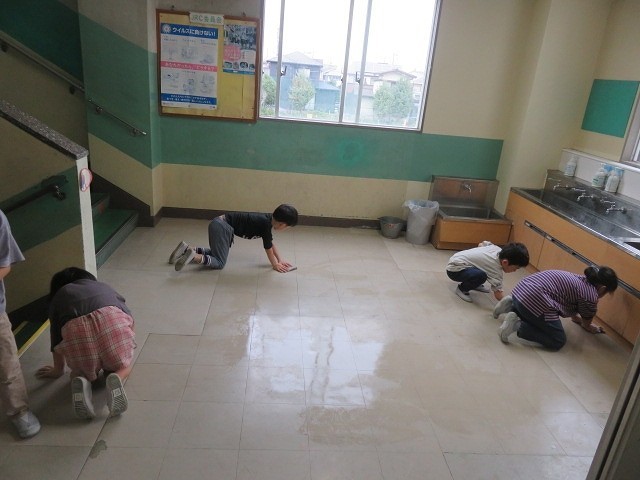 2年生が水道近くの床や階段の踊り場を一生懸命ふいていました。