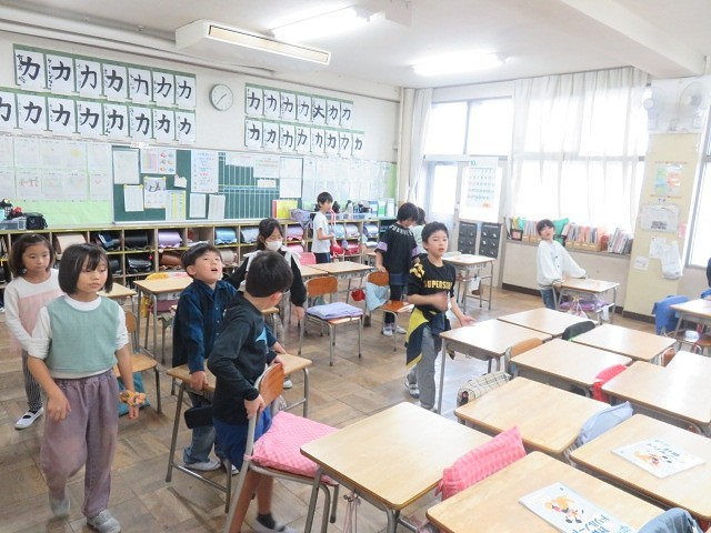 3年生の教室では,教科書等が入っている机を頑張って持ち上げて運んでいました。